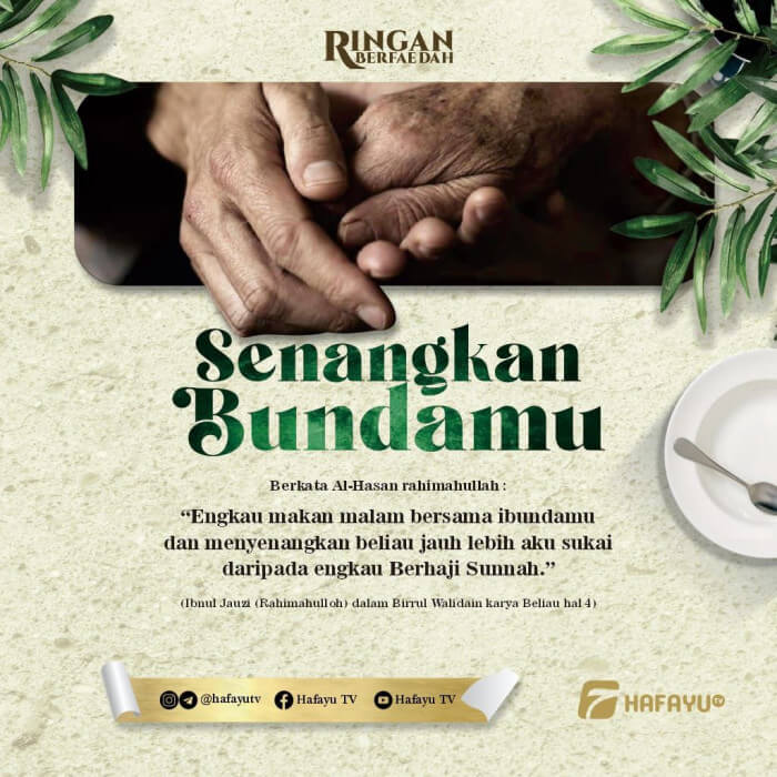 Berkata Al-Hasan rahimahullah : “Engkau makan malam bersama ibundamu dan menyenangkan beliau jauh lebih aku sukai daripada engkau Berhaji Sunnah.” Sumber : _📚 Ibnul Jauzi (Rahimahulloh) dalam Birrul Walidain karya Beliau hal 4. Terasa berfaedah ? Kita amalkan dan tebarkan manfaatnya. Group Ikhwan : https://hafayu.tv/ikhwan Group Akhwat : https://hafayu.tv/akhwat ——- Media Hafayu TV ——-