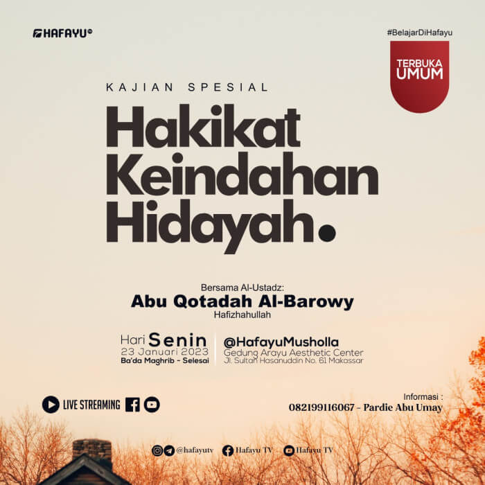 *BELAJAR DI HAFAYU* _Ayo Ke Taman-Taman Syurga_ ๐ Pembahasan: *Kajian Rutin | Jalan Golongan Yang Selamat (Karya Syaikh Muhammad Jamil Zainu ุญูุธู ุงููู)* ๐ Pemateri: *Al-Ustadz Muhajir Jamaluddin Al-Maidany ุญูุธู ุงููู* ๐ Waktu: Setiap Hari Kamis | Ba’da Subuh – Selesai. ๐ Tempat: Mushalla Hafayu Lt. 5 (Ikhwan) & 6 (Akhwat), […]